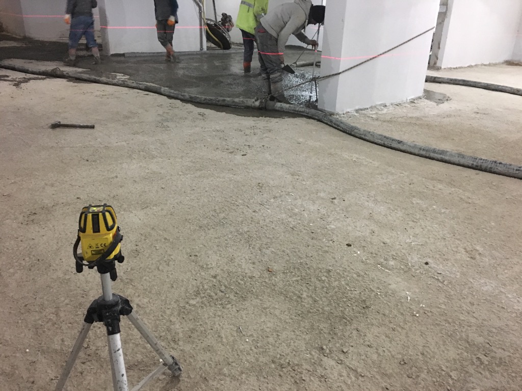 Sabit beton pompası ile Hazır beton dökümü işlemi gerçekleştirilerek betonun lazer terazi ile kodlarının alınması ve mastarlanma işleminin tamamlanması.